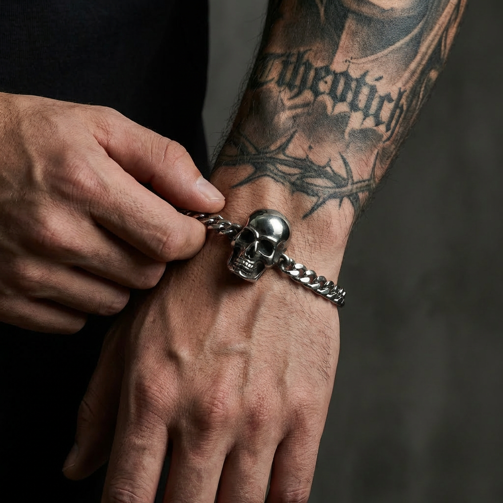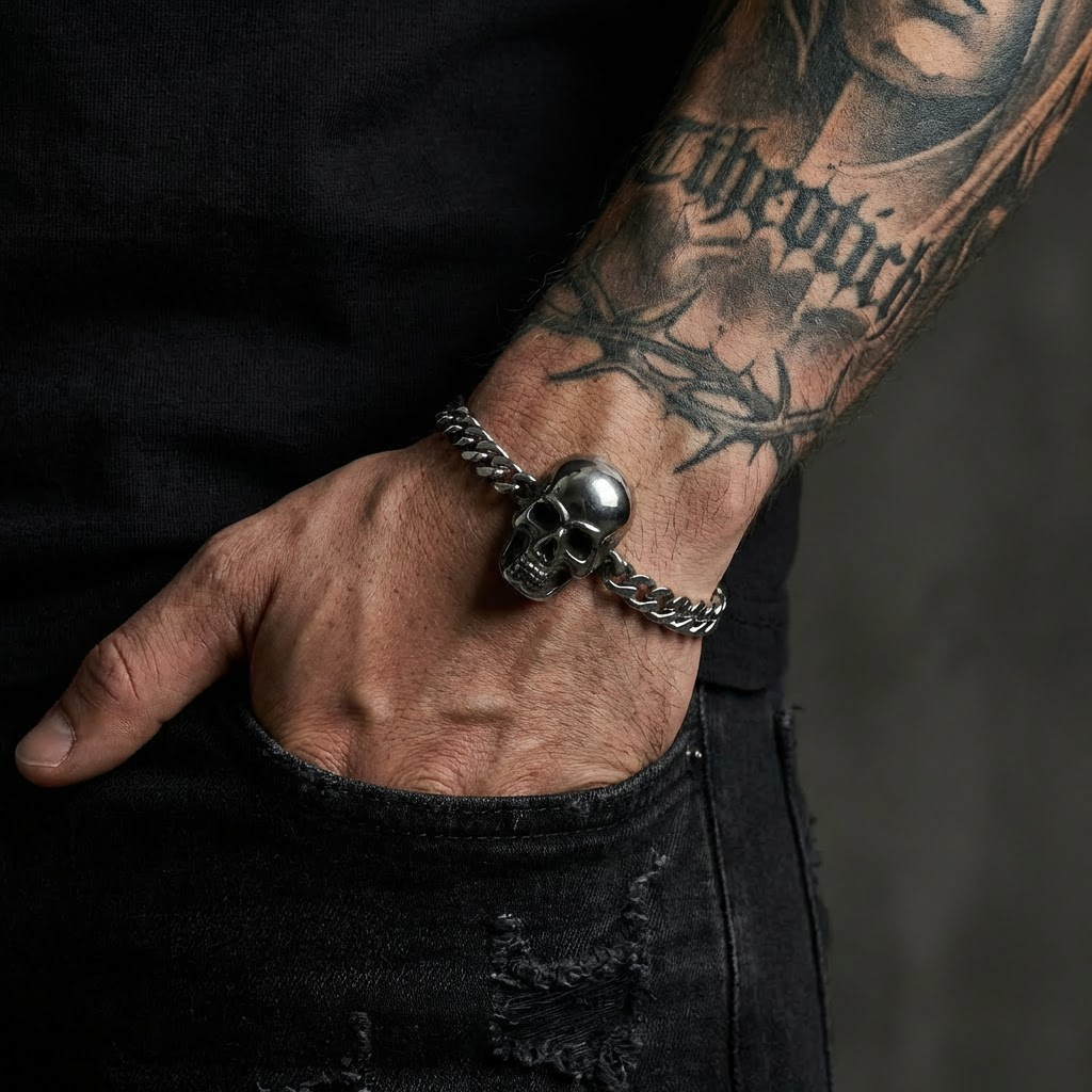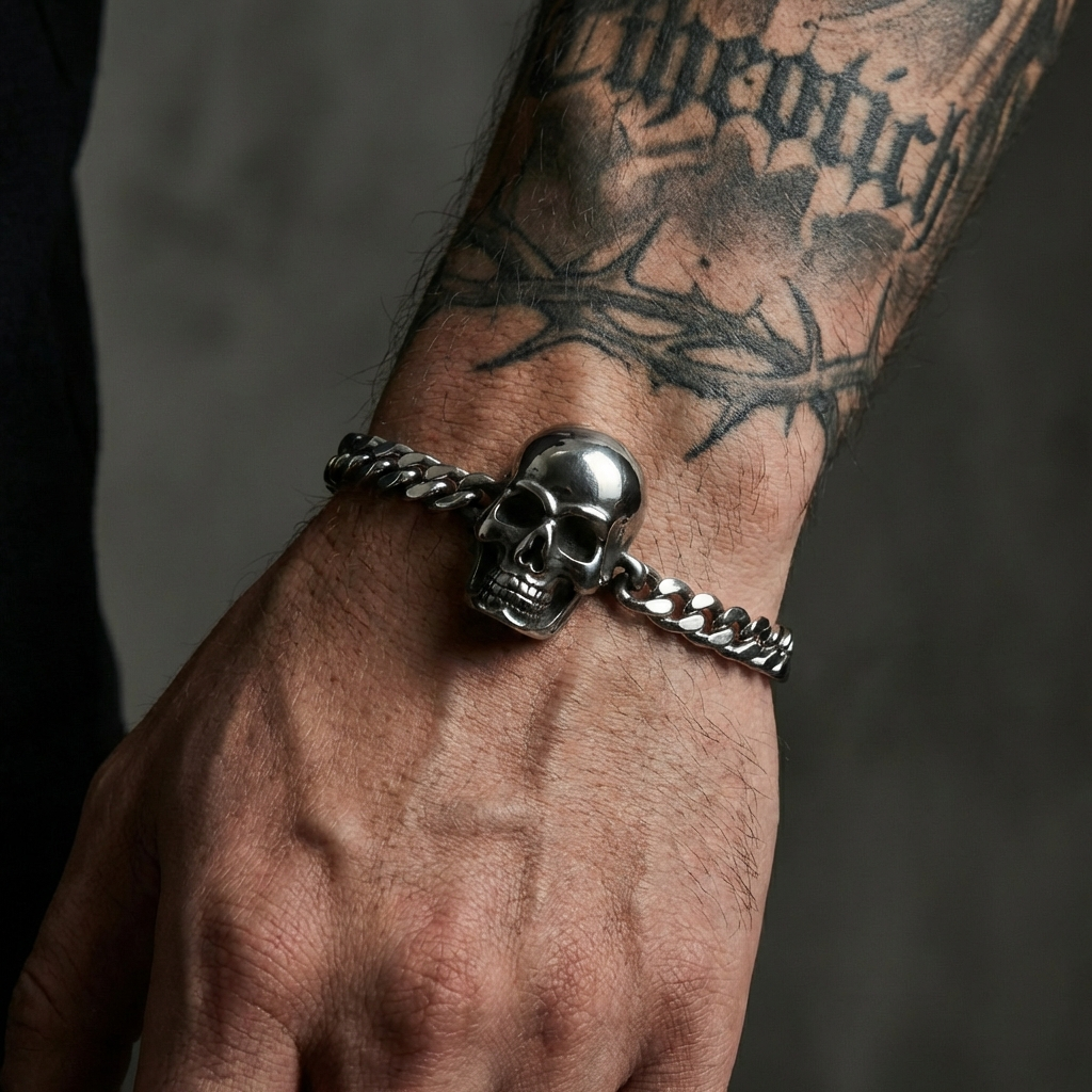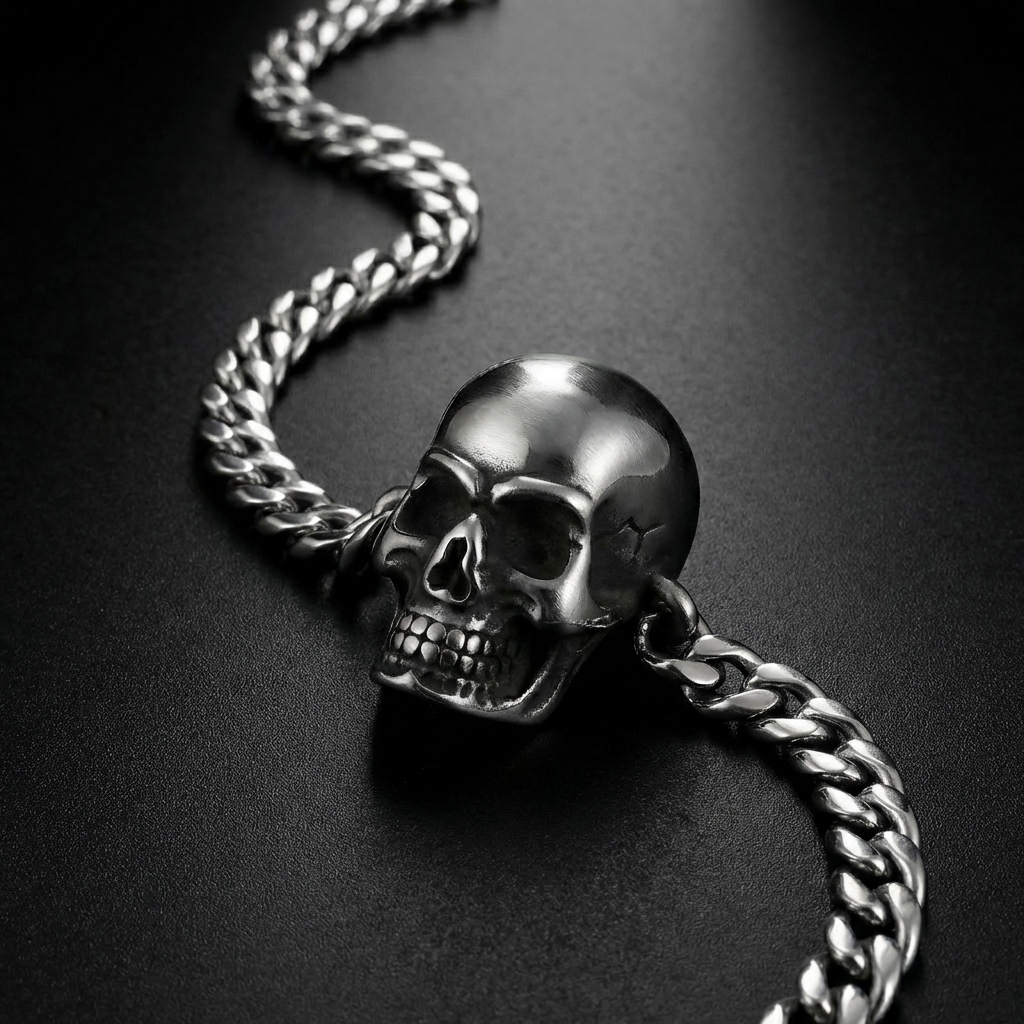 If you wanted basic, you wouldn’t be here. This bracelet drips attitude, anchored by a skull that represents every rule you’ve shattered. Heavy on the wrist, heavier on impact.